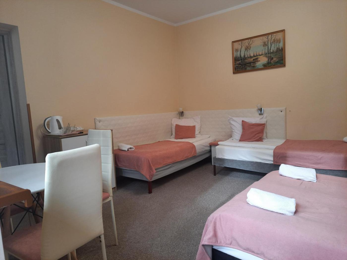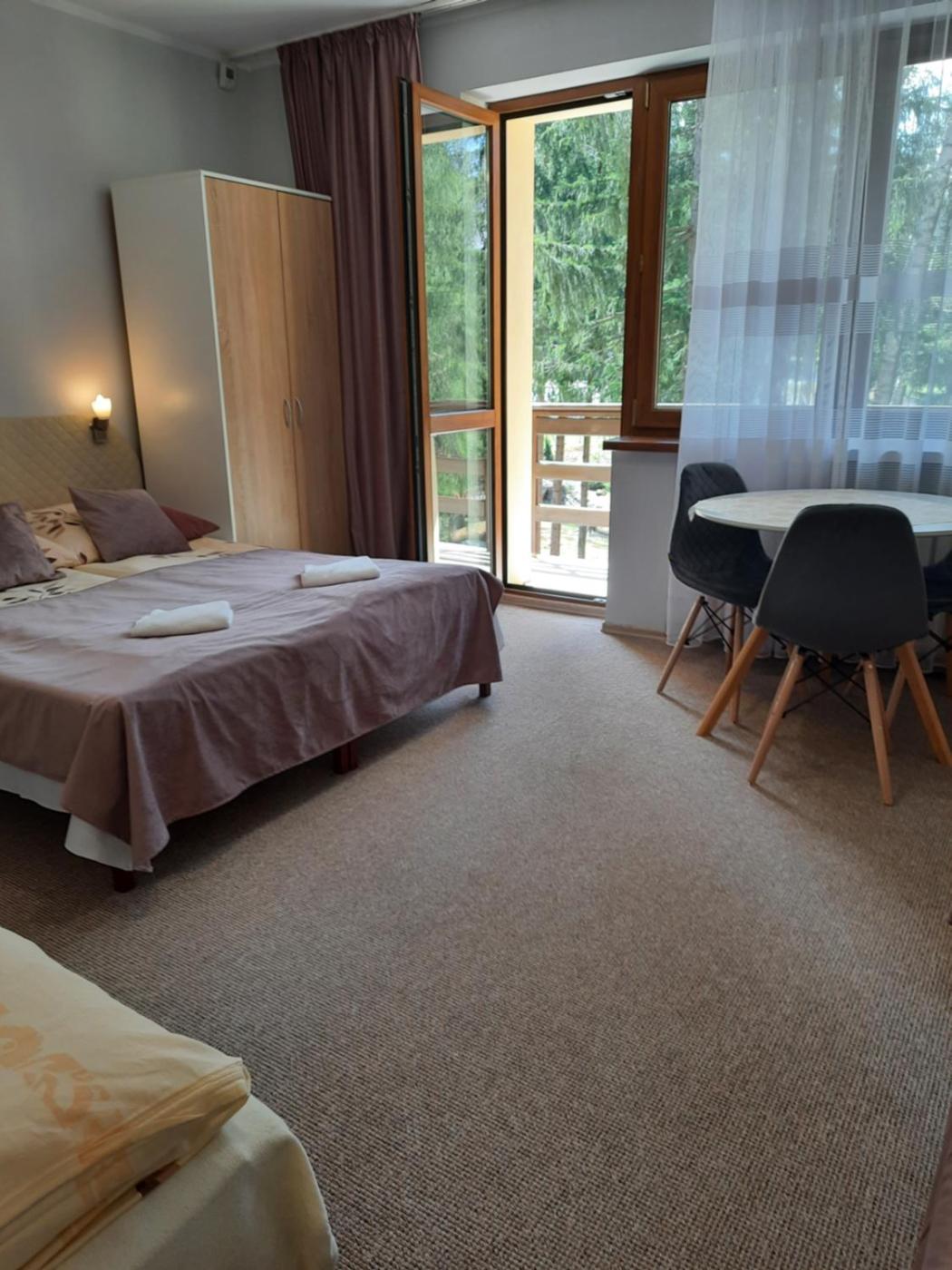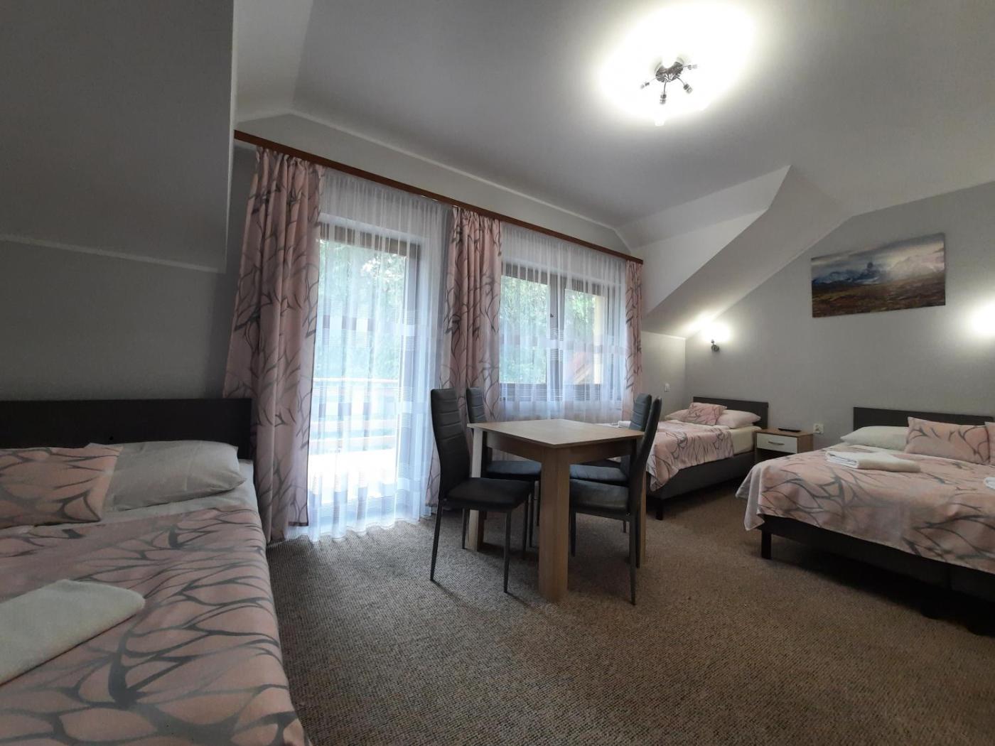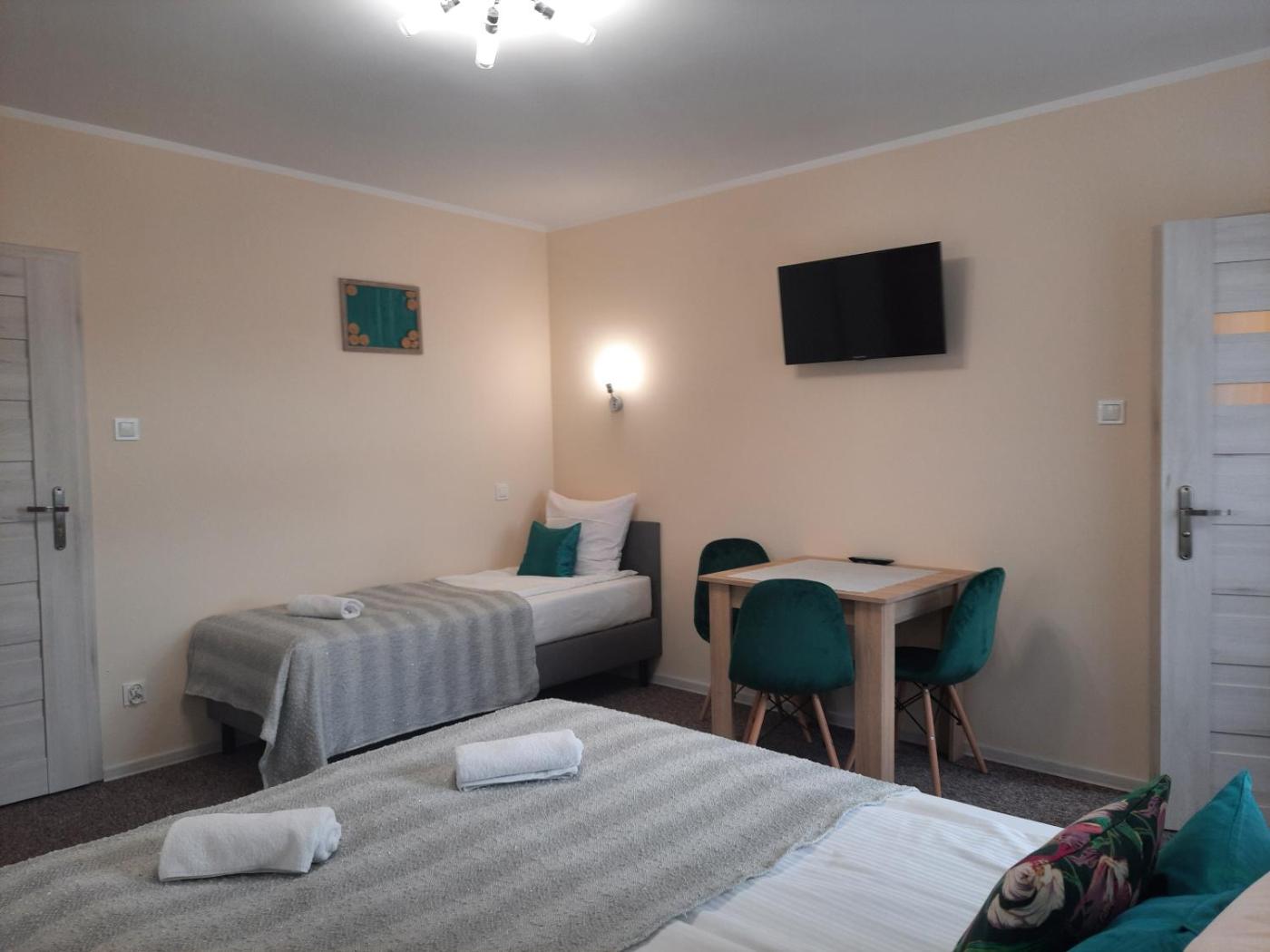 Pokój Czteroosobowy z balkonem. The quadruple room offers a tea and coffee maker, a dining area, a balcony with garden views as well as a private bathroom boasting a shower. The unit has 3 beds. Pokój Czteroosobowy - 5 osobowy. Powierzchnia pokoju ok.: 25 mkw. ;