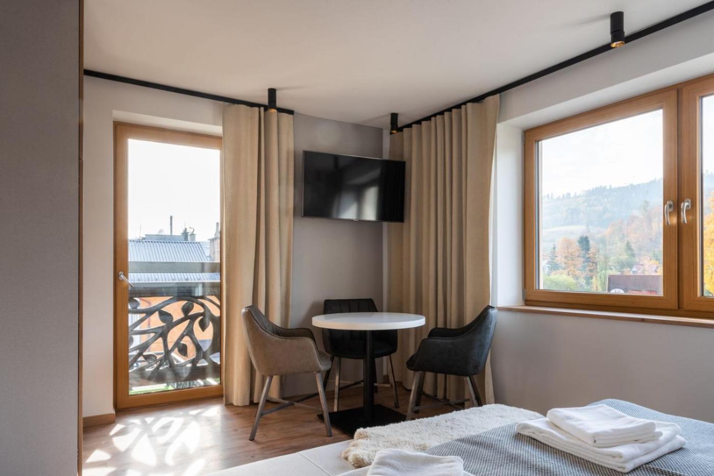 Pokój Dwuosobowy typu Deluxe. The double room includes a private bathroom fitted with a walk-in shower and a hairdryer. The air-conditioned double room offers a flat-screen TV with streaming services, soundproof walls, a wardrobe, heating as well as mountain views. Pokój Dwuosobowy - 2 osobowy. Powierzchnia pokoju ok.: 15 mkw. ;