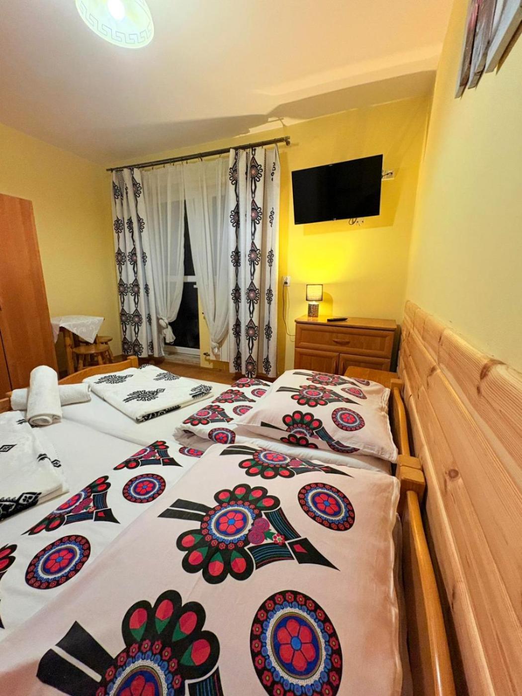 Pokój Czteroosobowy. This room is decorated with pastel colours and features a TV and a bathroom. Pokój Czteroosobowy - 4 osobowy. Powierzchnia pokoju ok.: 16 mkw. ;