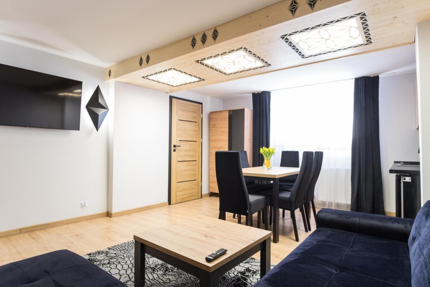 Apartament – parter. Ten apartament mieści salon, oddzielną sypialnię oraz łazienkę z prysznicem i suszarką do włosów. Posiłki można przygotowywać w doskonale wyposażonym aneksie kuchennym z płytą kuchenną, lodówką, przyborami kuchennymi oraz zestawem do parzenia kawy i herbaty. Udogodnienia w apartamencie obejmują także jadalnię, szafę, sofę i telewizor z płaskim ekranem. Z okien roztacza się widok na góry. W tej opcji zakwaterowania zapewniono 2 łóżka. Apartament - 4 osobowy. Powierzchnia pokoju ok.: 32 mkw. ;